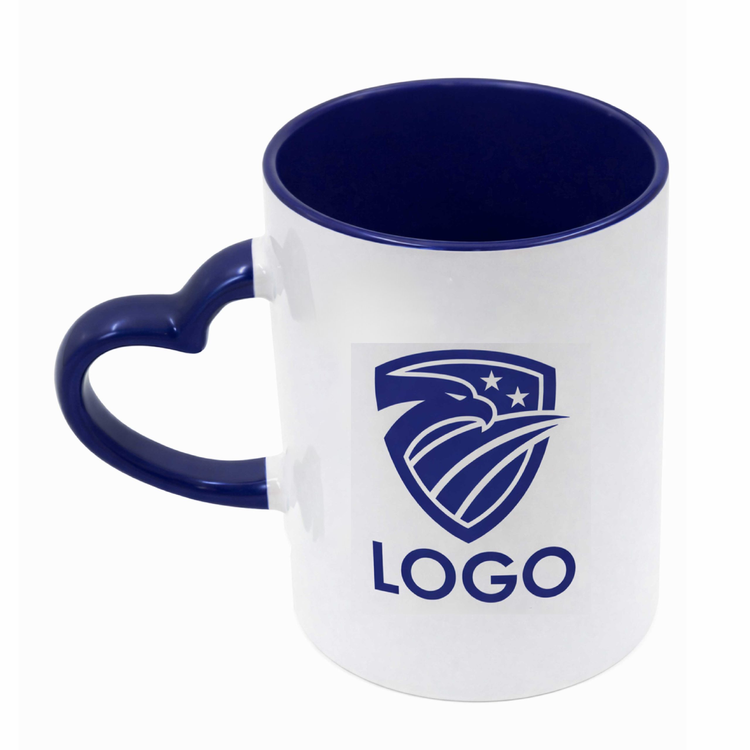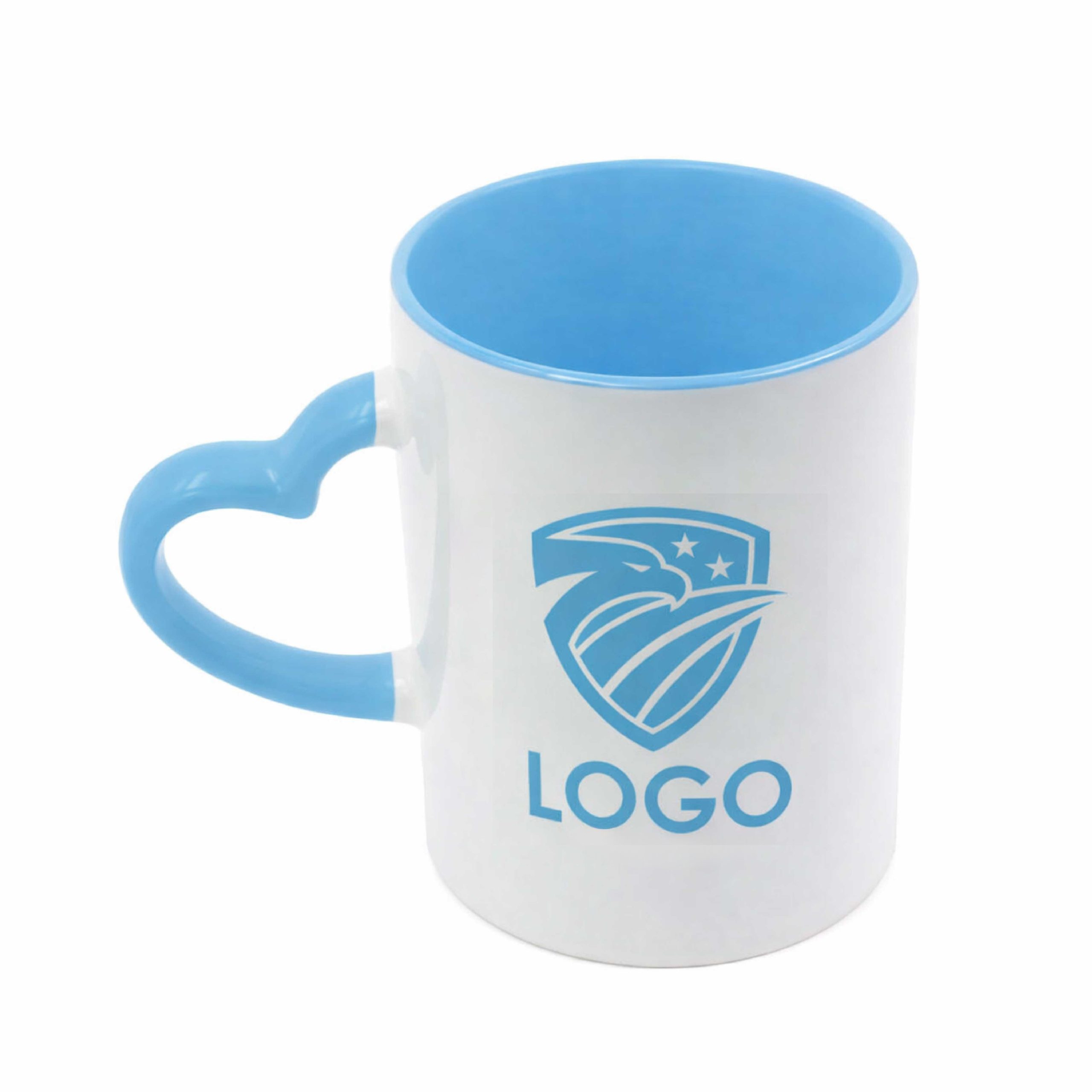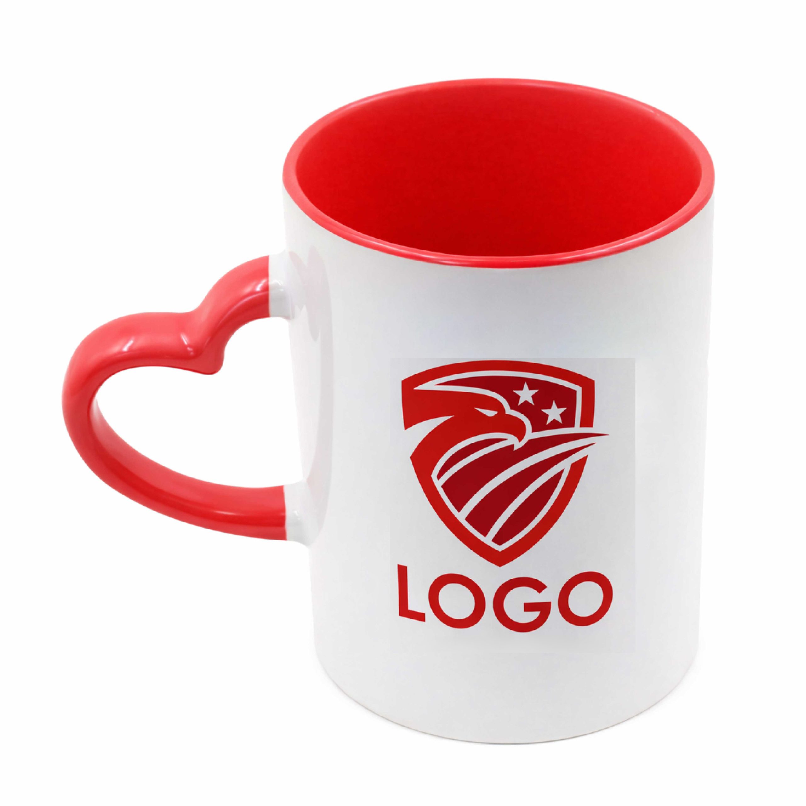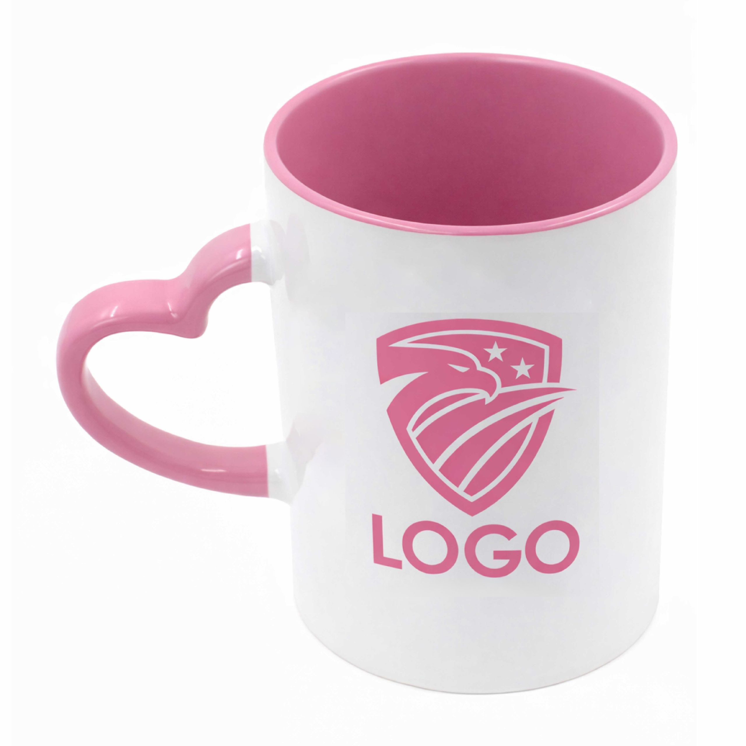 Weiße Keramiktasse mit herzförmigem Henkel, in verschiedenen Farben erhältlich, individuell personalisiert mit Ihrem Logo, Bildern und/oder Texten Ihrer Wahl.