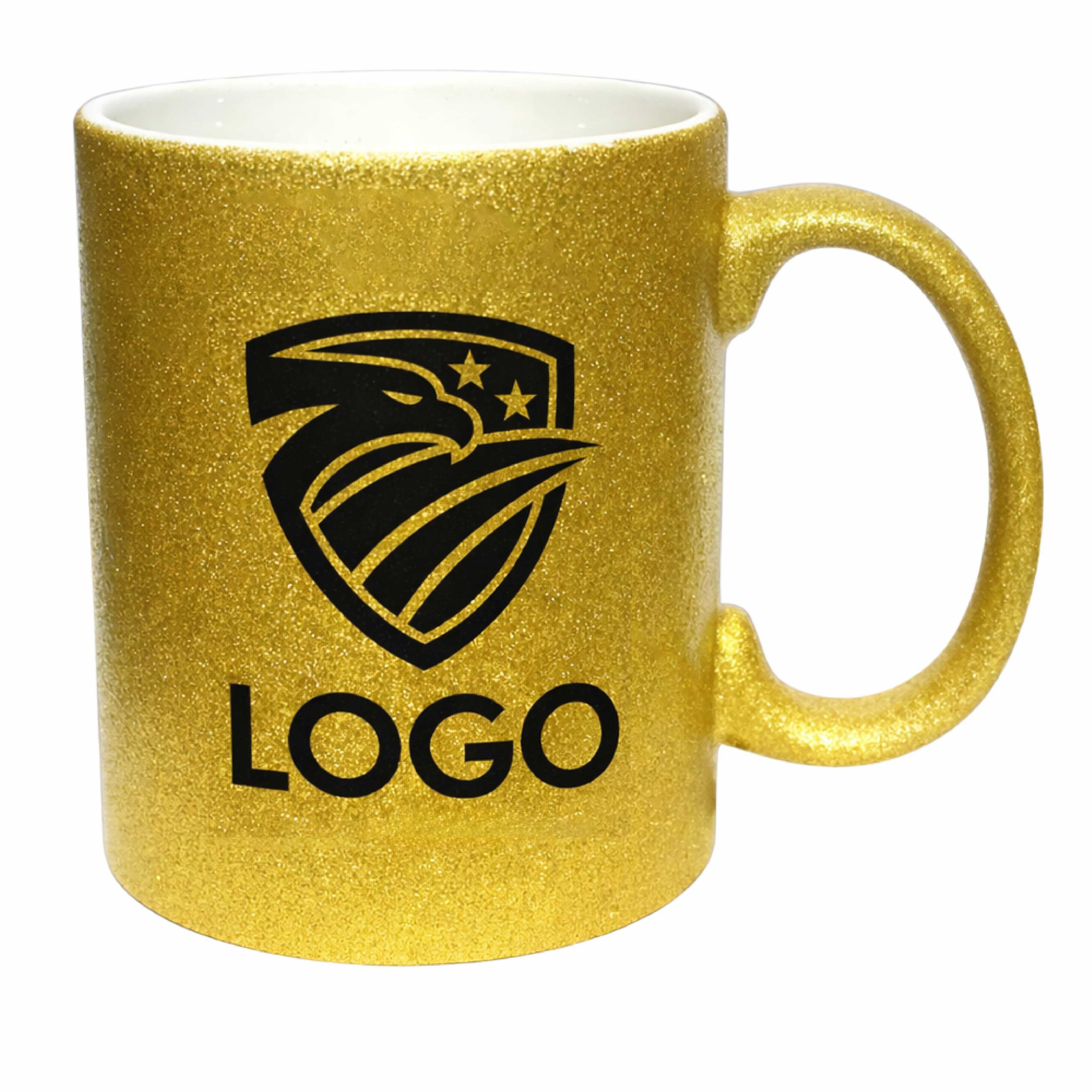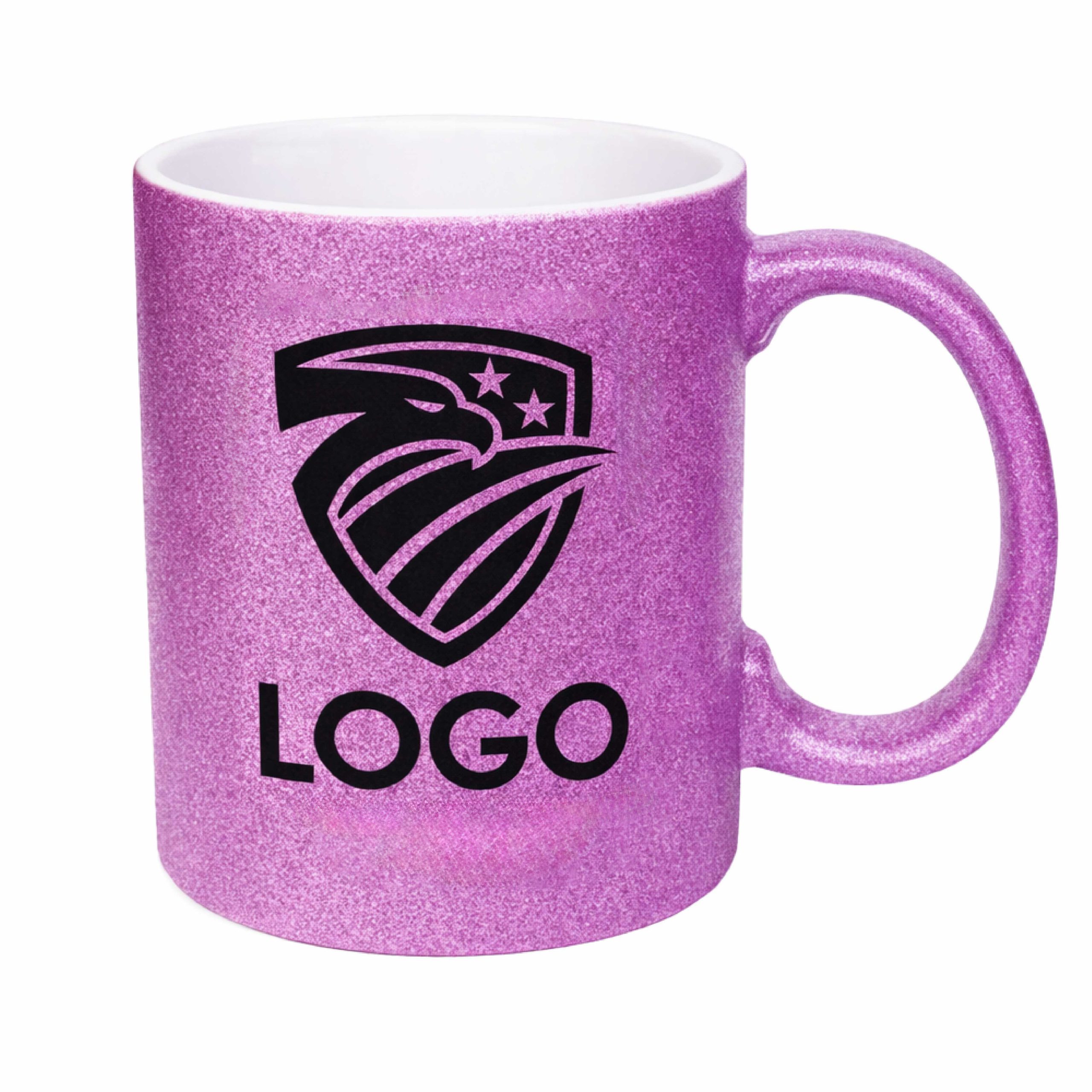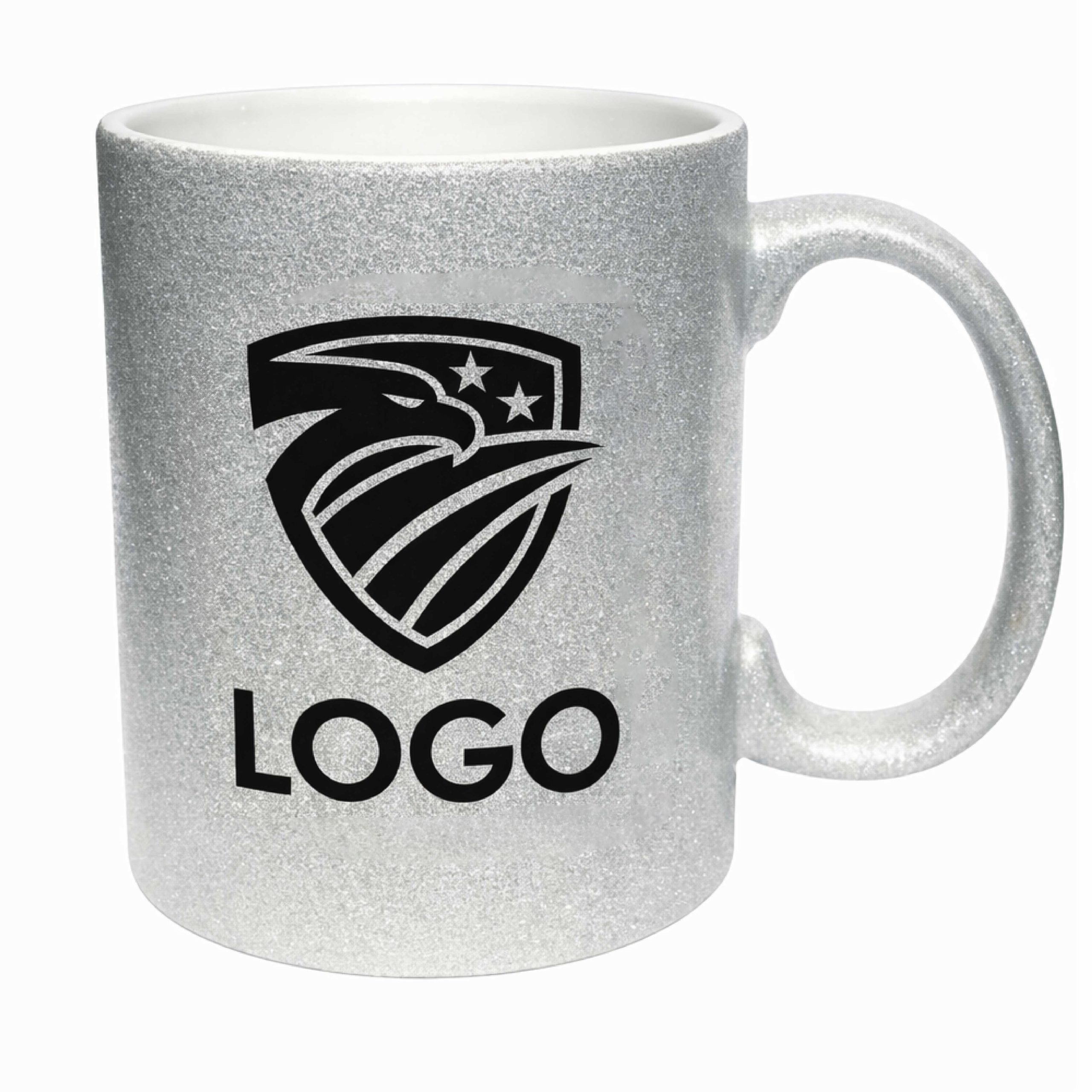 White ceramic mug, with a glitter-finish, customized with your logo, images, and/or text of your choice.