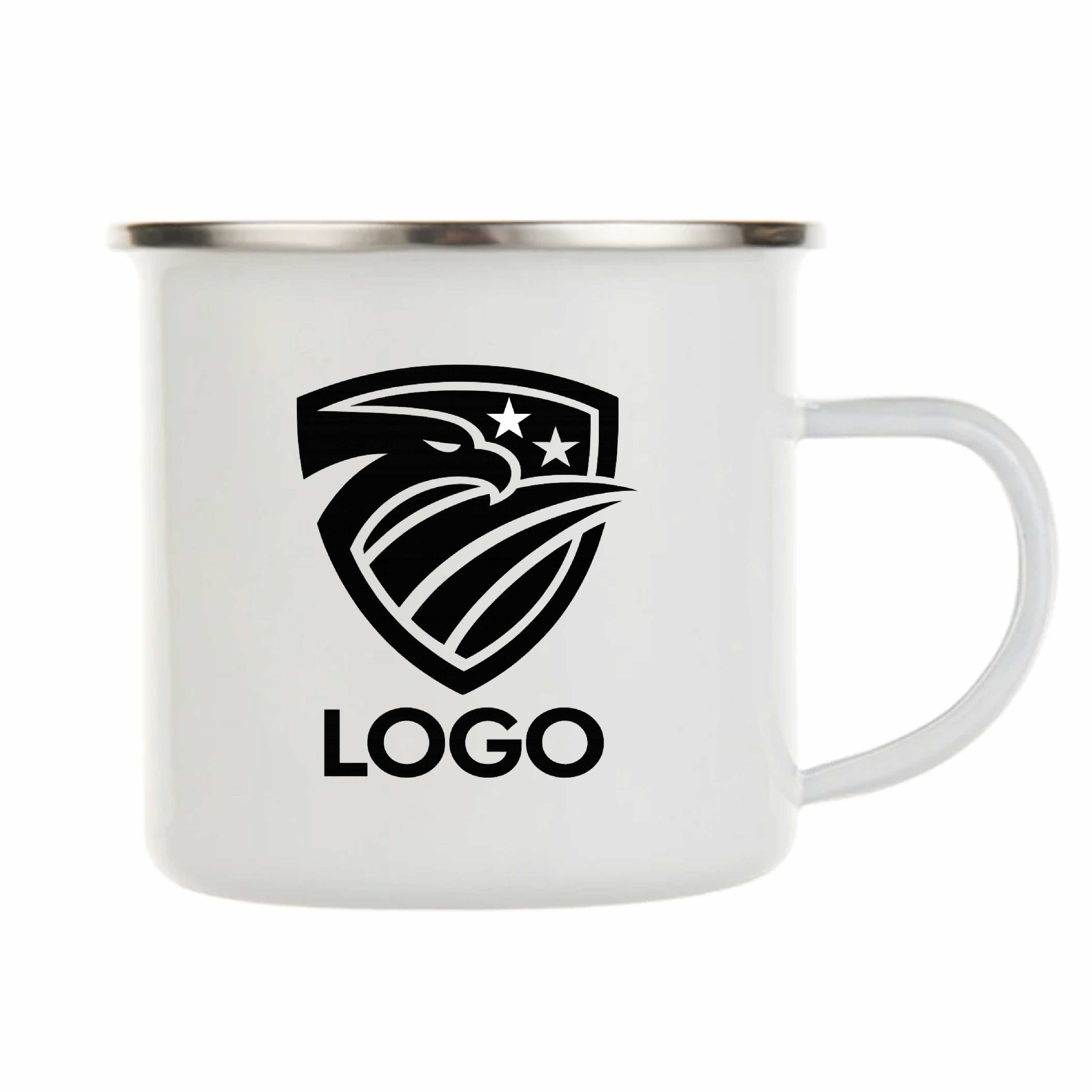 Enamel-coated metal mug, customized with your logo, images, and/or text of your choice.