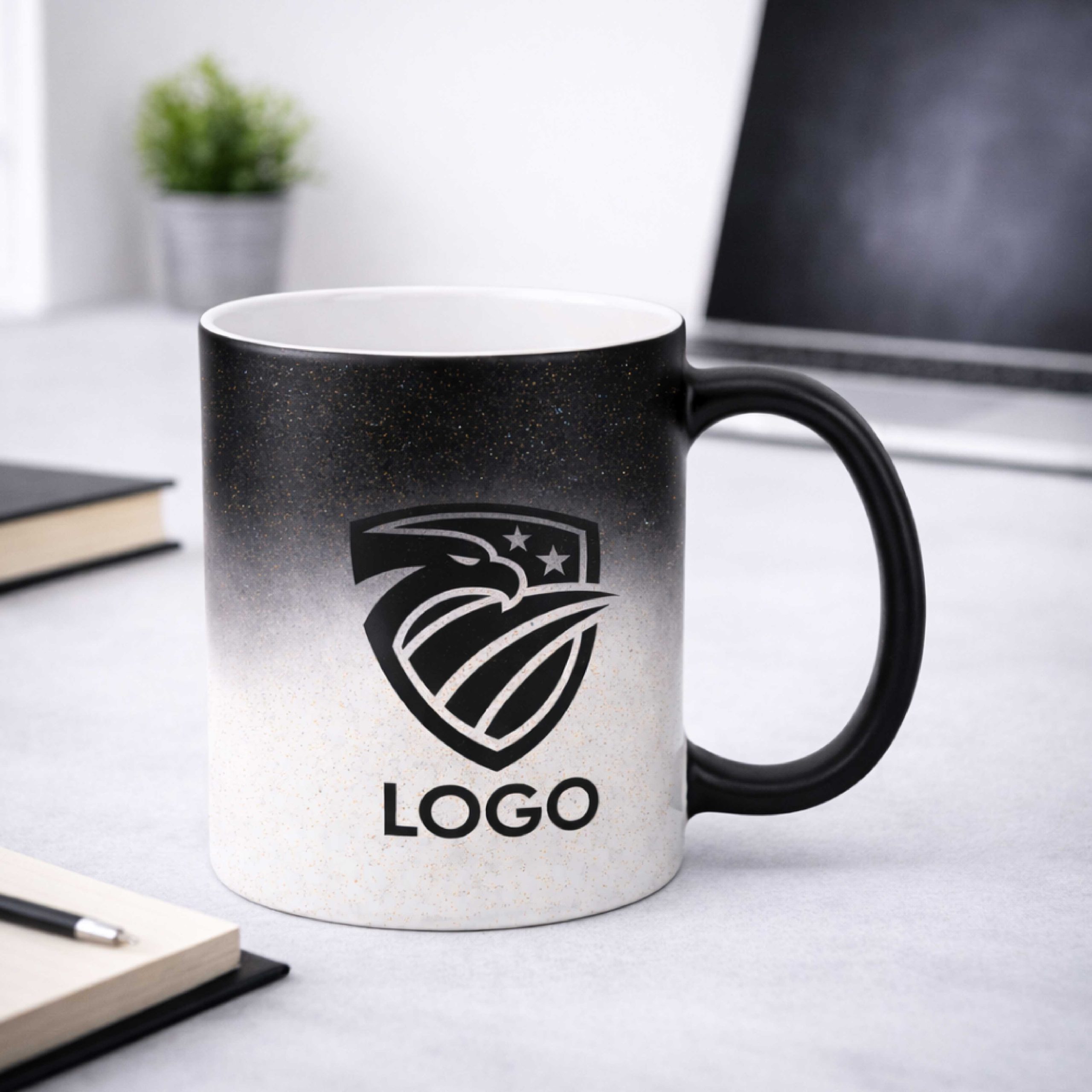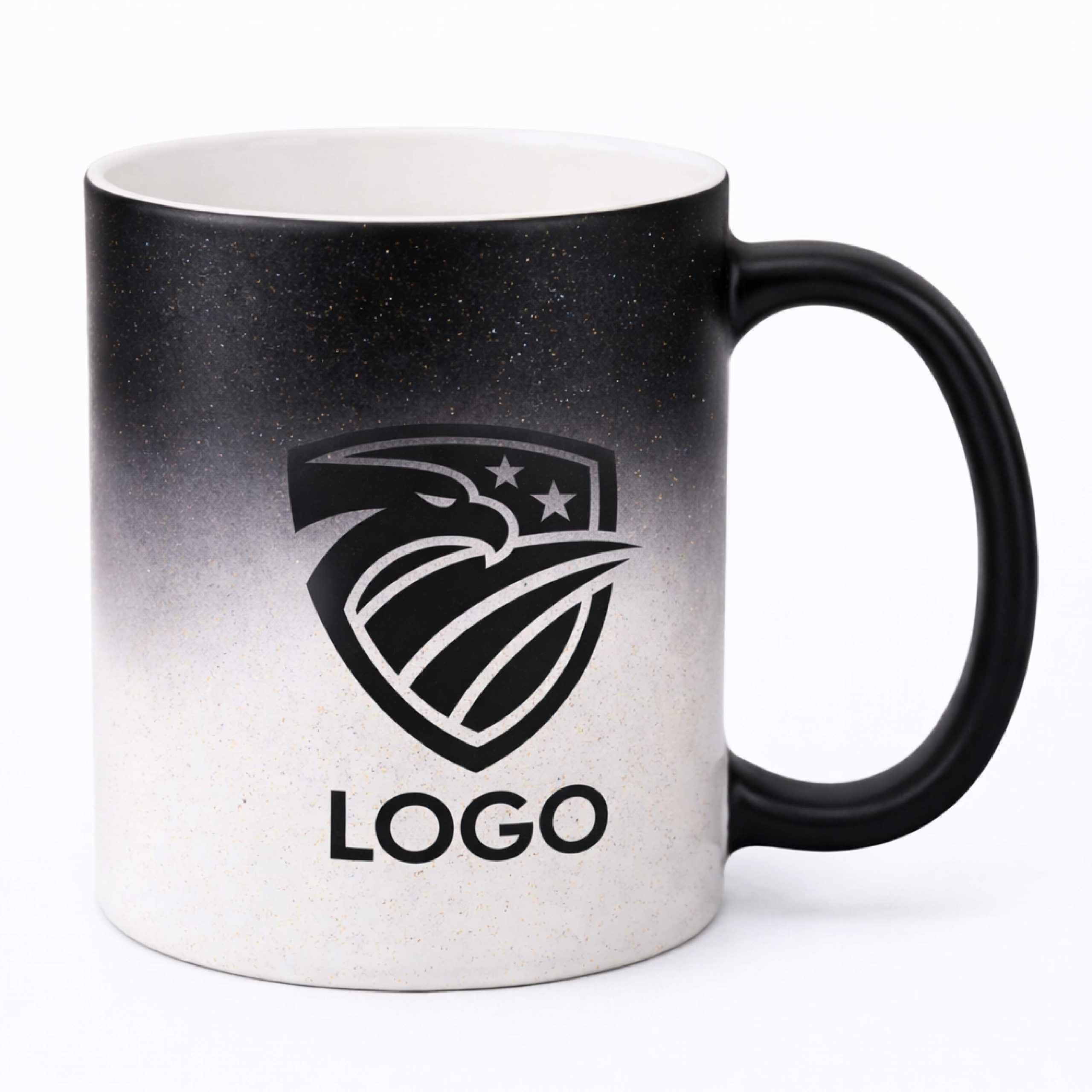 Glitter magic mug, coated with a blach heat sensitive coating, customized with your logo, images, and/or text of your choice.