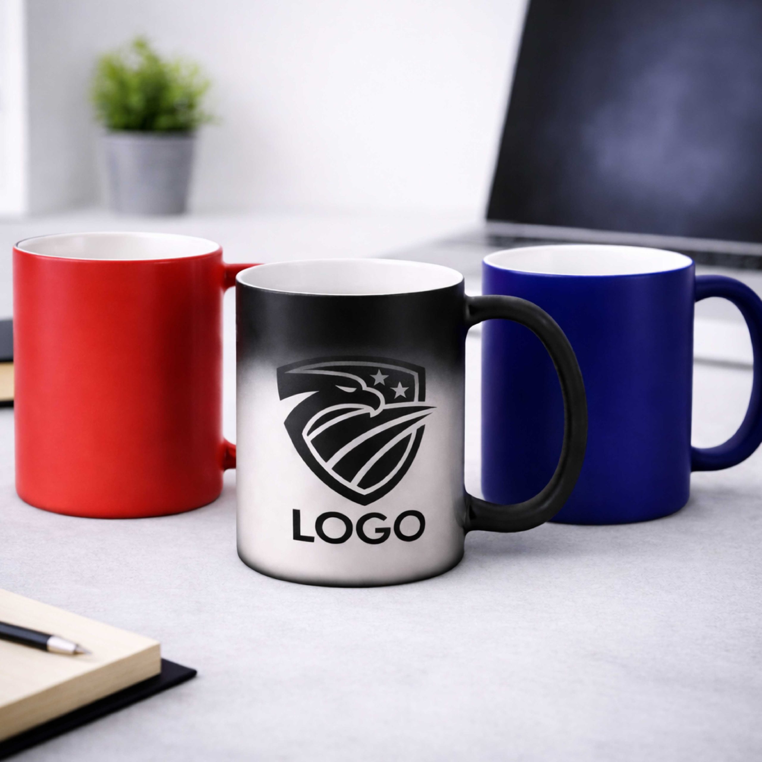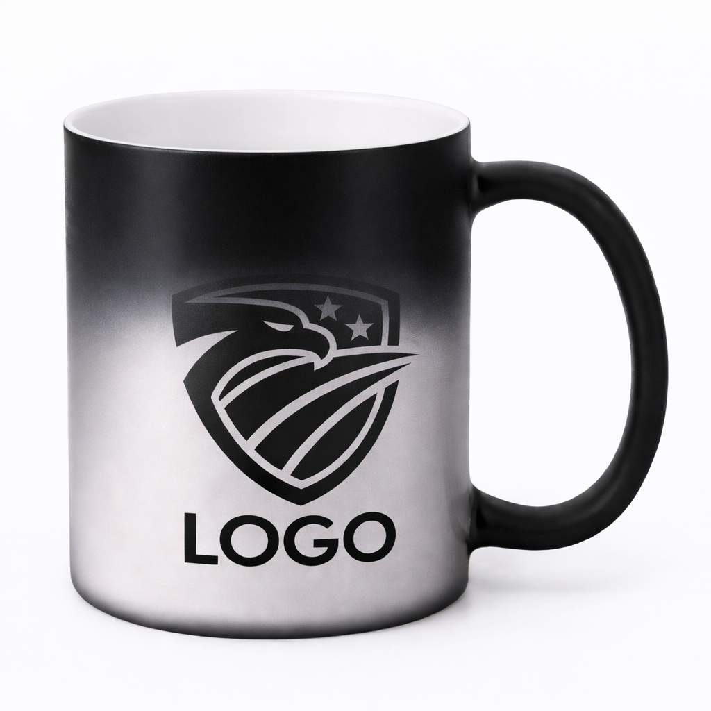 White ceramic mug, coverd in a heat-sensitive coating, colored in various colors, customized with your logo, images, and/or text of your choice.